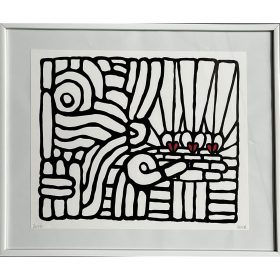 Le « souffleur de cœur » Téva, dont le nom signifie, en tahitien, « le grand voyageur » mais aussi « l’averse d’amour », est le plus souvent réalisé en noir et blanc, par des tracés qui rappellent le tatouage traditionnel polynésien. Chaque apparition de Téva est comme une scène de nos vies quotidiennes, nous rappelant qu’à chaque instant et dans chaque geste, l’amour doit être omniprésent, grâce à un cœur soufflé, posé, offert au spectateur.