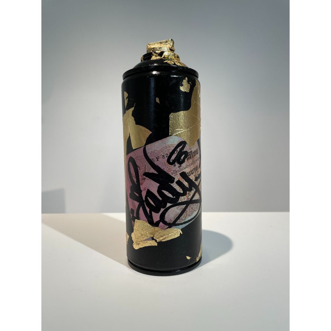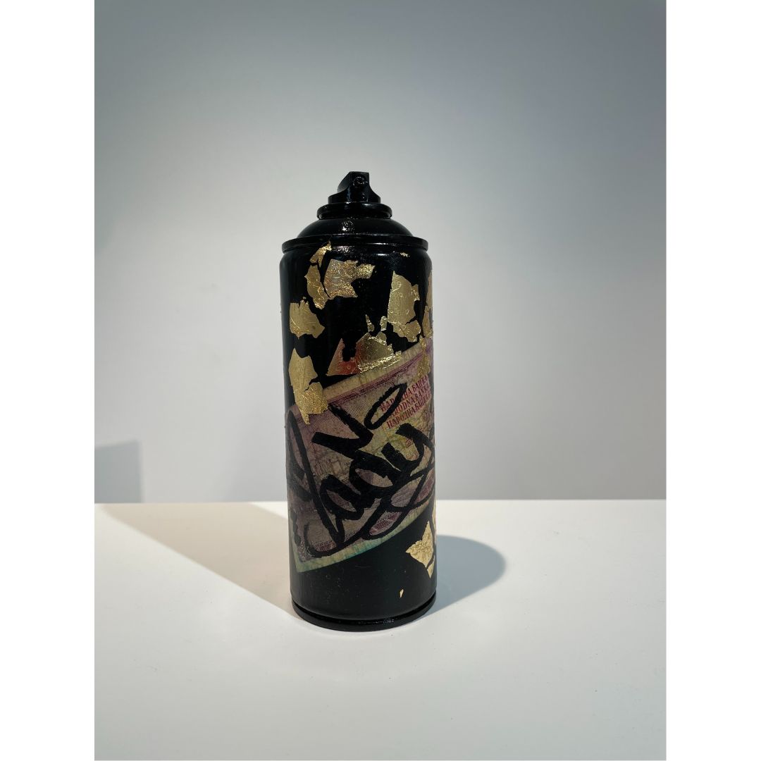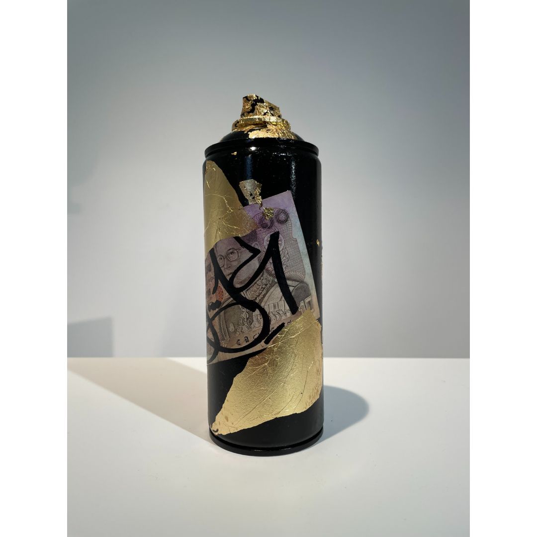Bombe marouflée avec feuille d’or et billet de banque tagué.