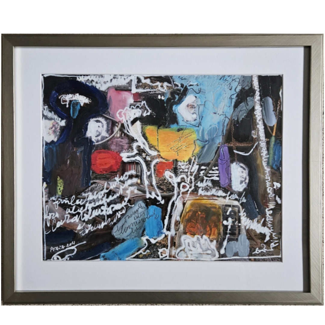 Proche de l’art brut, ses compositions figuratives mêlent peinture, collage et texte.
