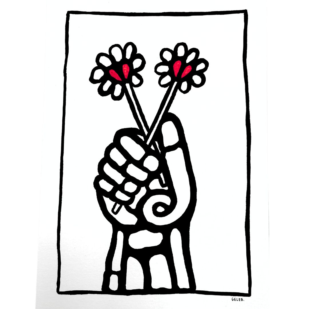 Inspiré par la Polynésie, Tom GELEB diffuse l’amour à travers son personnage Téva, le « souffleur de cœur ». Des murs de la ville aux créations sur toile, il décline un trait noir et blanc hérité du tatouage traditionnel pour offrir au spectateur une averse de bienveillance.