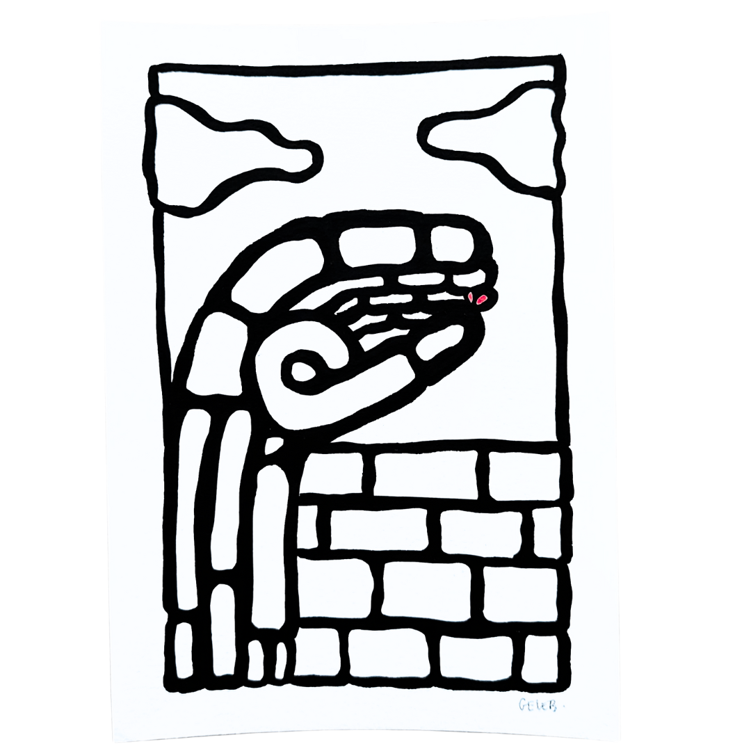 Inspiré par la Polynésie, Tom GELEB diffuse l’amour à travers son personnage Téva, le « souffleur de cœur ». Des murs de la ville aux créations sur toile, il décline un trait noir et blanc hérité du tatouage traditionnel pour offrir au spectateur une averse de bienveillance.